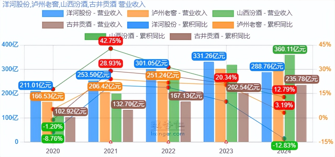 数据显示,三季度单季营收,山西汾酒三季度营收89.60亿元,泸州老窖营收66.74亿元,洋河股份32.95亿元,古井贡酒25.45亿元;前三季度累计营收则是山西汾酒329亿元,泸州老窖231.27亿元,洋河股份180.90亿元,古井贡酒164.25亿元。