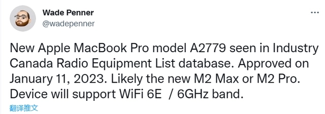 1月11日,苹果在加拿大监管数据库中提交了一款型号为A2779的未发布版本MacBook Pro,据文件中提到的无线频率范围,它可能会支持Wi-Fi6E,扩展Wi-Fi到6GHz频段,以获得更多带宽,更快速度和更低延迟。