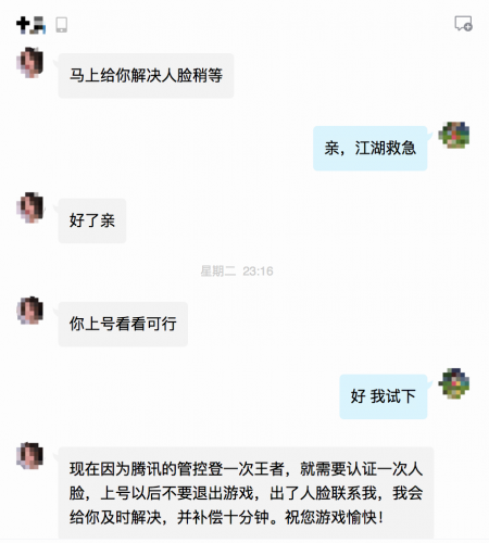 尽管如此,人脸识别验证也不能保证万无一失。一位租号商家客服告诉TechWeb,腾讯最近严格管控《王者荣耀》,登陆一次就需要认证一次人脸。但这些租号方都能及时解决,还承诺补偿十分钟游戏时长。由于腾讯每天对人脸验证的次数有要求,该客服还建议上号之后尽量不要退出。