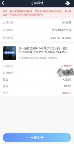比如,TechWeb在一家租号平台上填写了姓名、身份证信息后即下单成功,中间没有人脸识别等其他验证信息。24.5元就能玩3个小时《王者荣耀》,从9月7日23点到次日凌晨2点,一键上号,无需登录,巧妙避开防沉迷系统。