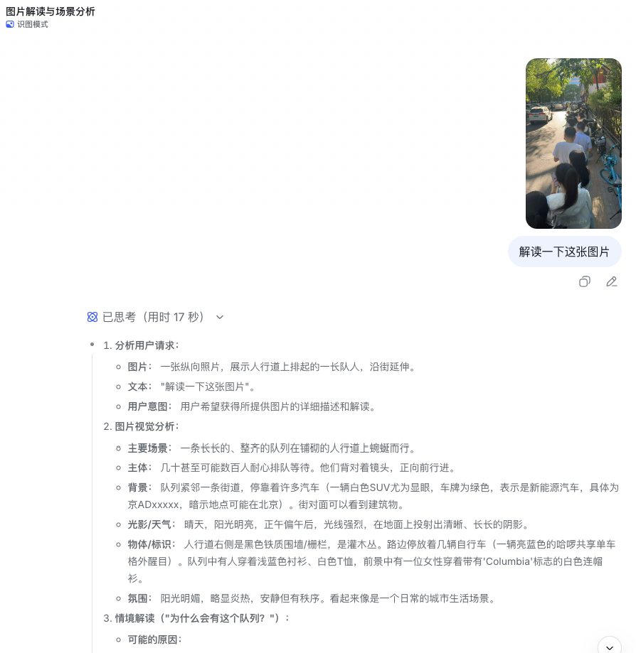 试用发现,该模式支持用户上传图片并进行内容理解与分析。