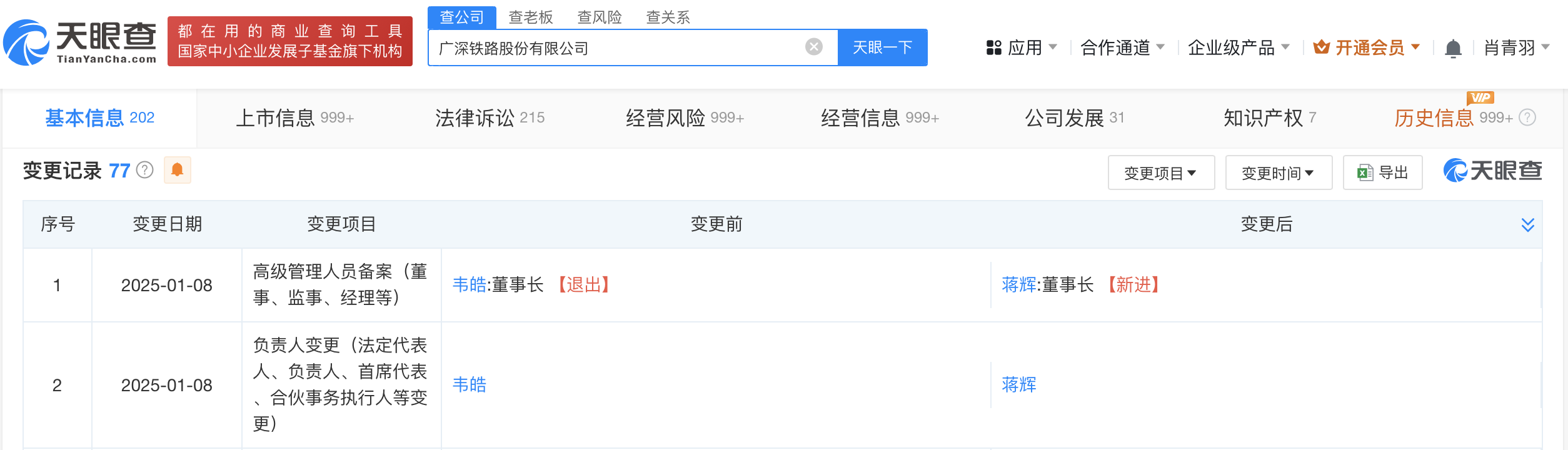 天眼查App显示,近日,广深铁路(601333)发生工商变更,韦皓卸任法定代表人、董事长,由蒋辉接任。