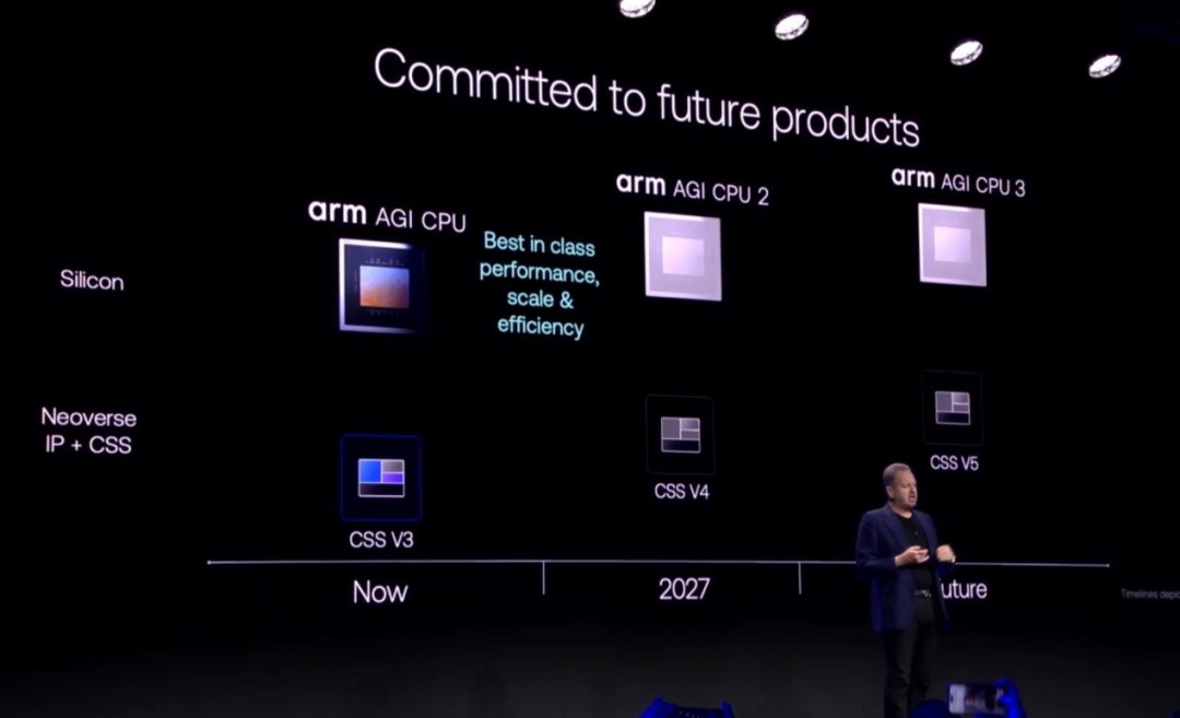 更长远来看,Rene Haas透露,Arm已规划了清晰的路线图:2027年将发布Arm AGI CPU 2和CSS V4,后续还有AGI CPU 3和CSS V5。