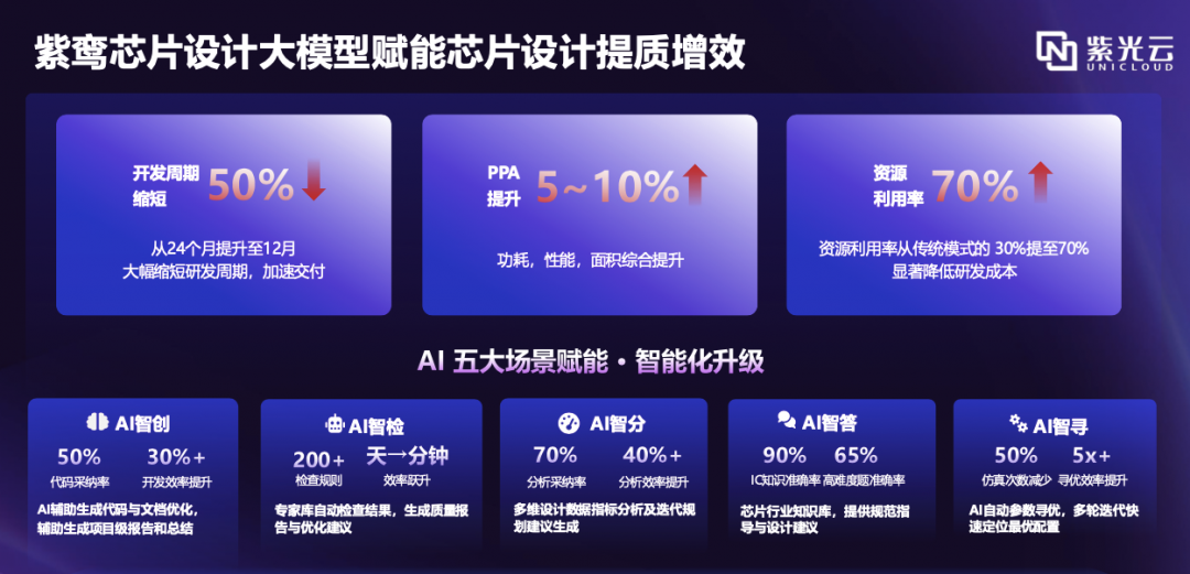紫光云首席技术官柳义利详细介绍了紫鸾芯片设计大模型的技术突破与应用价值。他表示,传统芯片设计周期通常为24个月,而通过AI赋能,可将周期压缩至12个月以内,同时提升芯片PPA(功耗、性能、面积)5%至10%,资源利用率提升至70%以上。