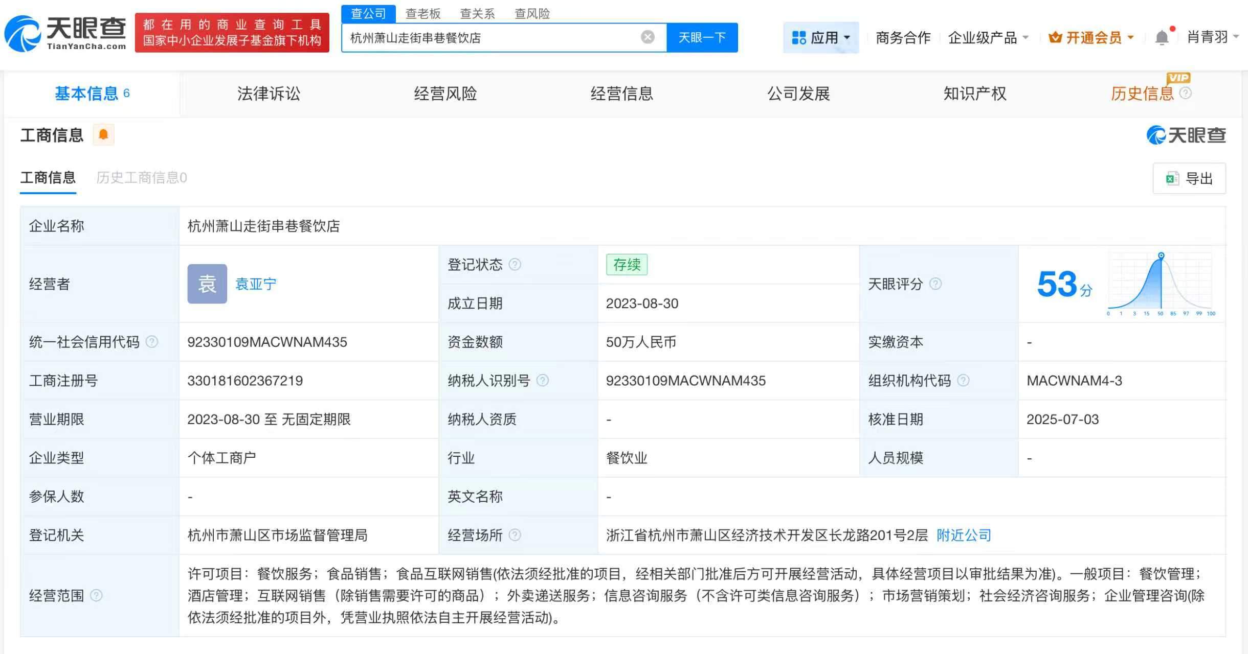 天眼查App显示,小袁关联店铺杭州萧山走街串巷餐饮店成立于2023年8月,为个体工商户,经营者为袁亚宁,资金数额50万人民币,经营范围包括餐饮服务、食品销售、食品互联网销售等。