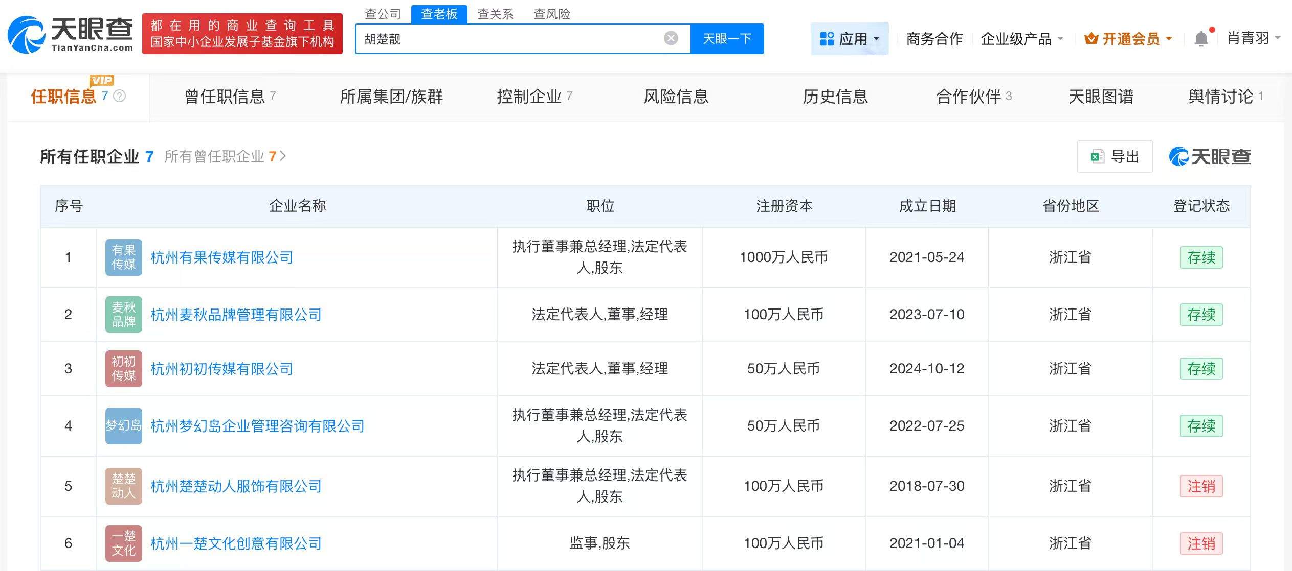 天眼查App显示,胡楚靓名下关联多家企业,其中4家处于存续状态,包括其签约MCN公司杭州有果传媒有限公司。