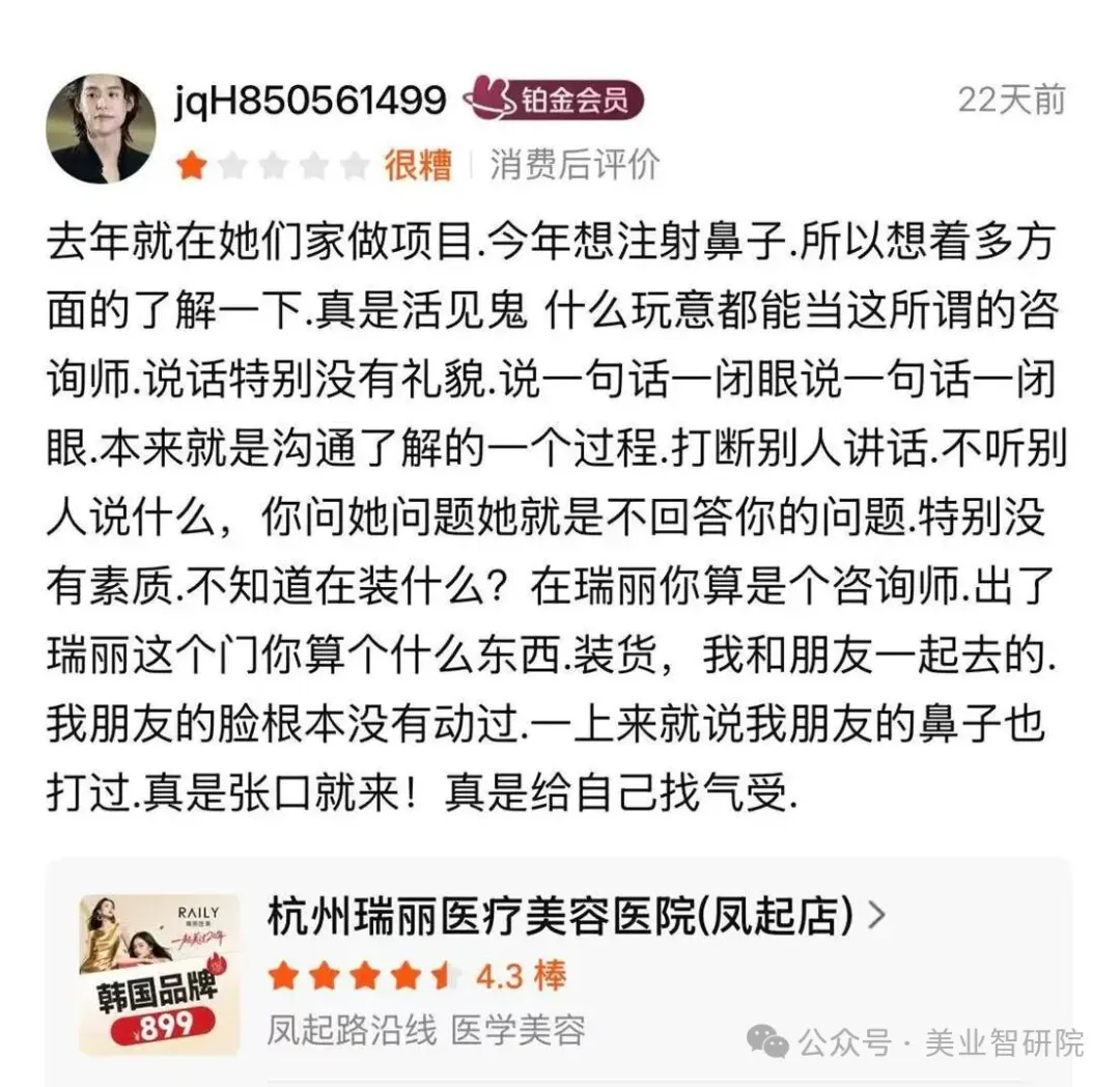 还有消费者无奈的表示,杭州瑞丽所谓“咨询师”连基本礼貌都没有。说话频翻白眼、随意打断、问三句不回一句,还张口就造谣“你朋友鼻子肯定打过”,把术前沟通变成阴阳怪气的“批斗会”。