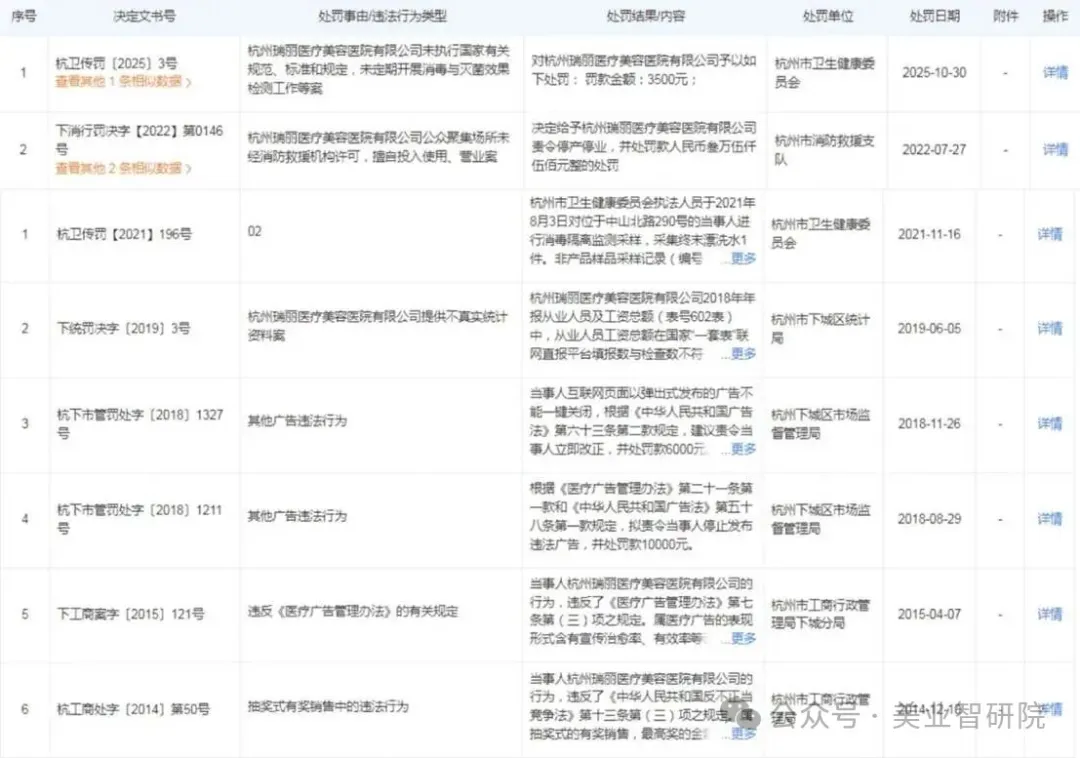 如果说服务态度差只是杭州瑞丽医美的“表面问题”,那么行政处罚记录,则是其内部管理混乱、违规经营的“铁证”。这些处罚涉及医疗安全、经营诚信、消防安全等多个层面,每一条都在敲响警钟,揭示着这家医美机构的重重乱象。