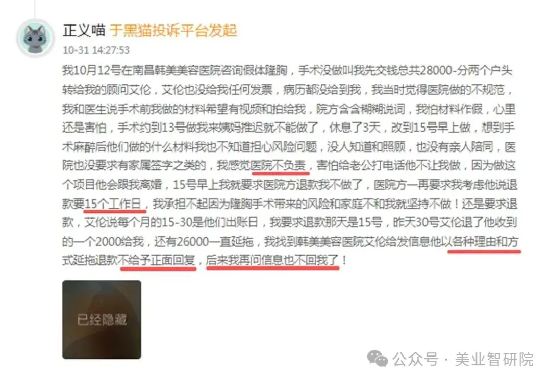 近日,一位消费者在黑猫投诉平台上的经历,把南昌韩美美容医院被推上风口浪尖。
