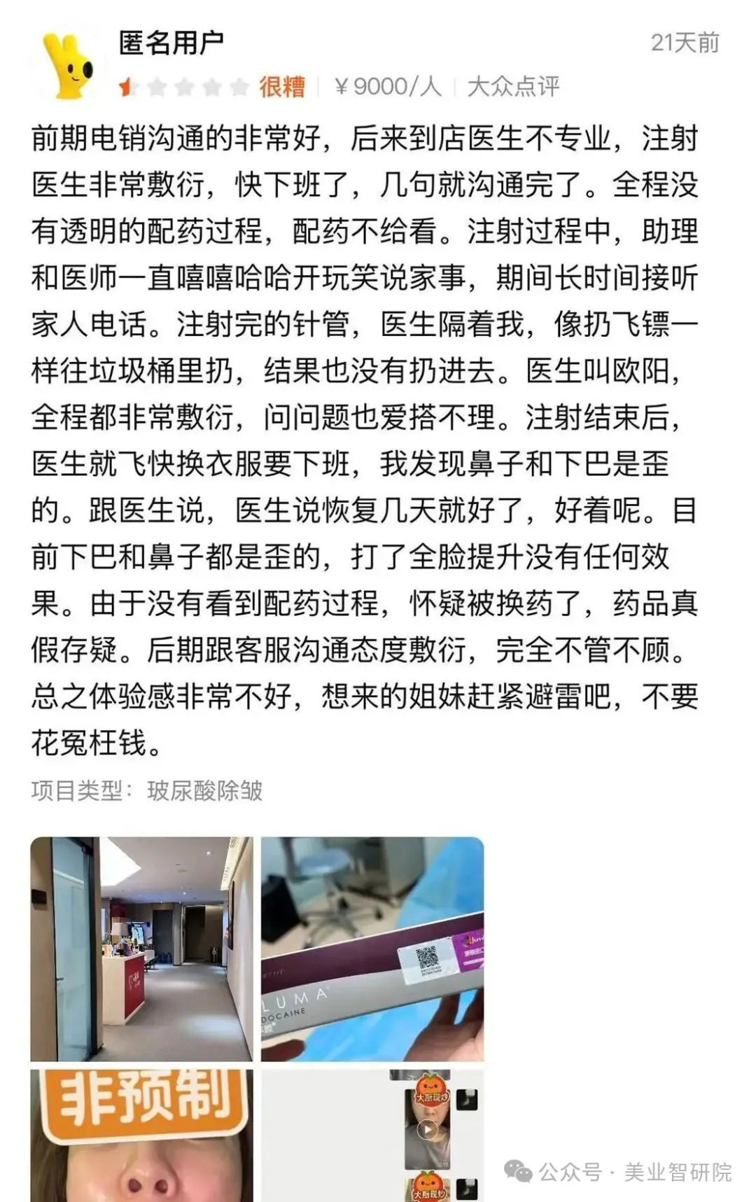 有消费者在美团上爆料南昌韩美“售前热、售后冷”,电销阶段承诺周到,到店后却遭遇“赶下班”式服务。并且注射医生被多人指名批评,术前仅用几句话匆匆沟通,配药过程完全不让旁观,药品真伪成谜。