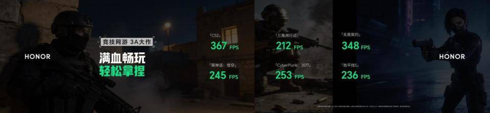 荣耀WIN游戏本 H9凭借全新Gaming Turbo X技术,实现全域性能调优、整机动态超频,在游戏体验上全方位升级,为玩家带来最强“打洲本”体验。在开启Gaming Turbo X技术后,荣耀WIN游戏本 H9可实现《三角洲行动》212 FPS,《黑神话·悟空》245 FPS,《赛博朋克2077》253 FPS。
