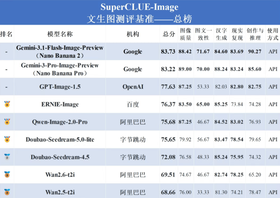 在评测表现上,ERNIE-Image 在多项权威基准中取得领先成绩。其中,在 SuperCLUE 文生图榜单中,ERNIE-Image 综合排名位列国内第一、全球第四,仅次于 Nano Banana 2、Nano Banana Pro 和 GPT-Image-1.5,超过 Qwen-Image-2.0-Pro、Doubao-Seedream-5.0-Lite 等模型;同时,在图文一致性与汉字生成两项细分指标中均位列国内第一。