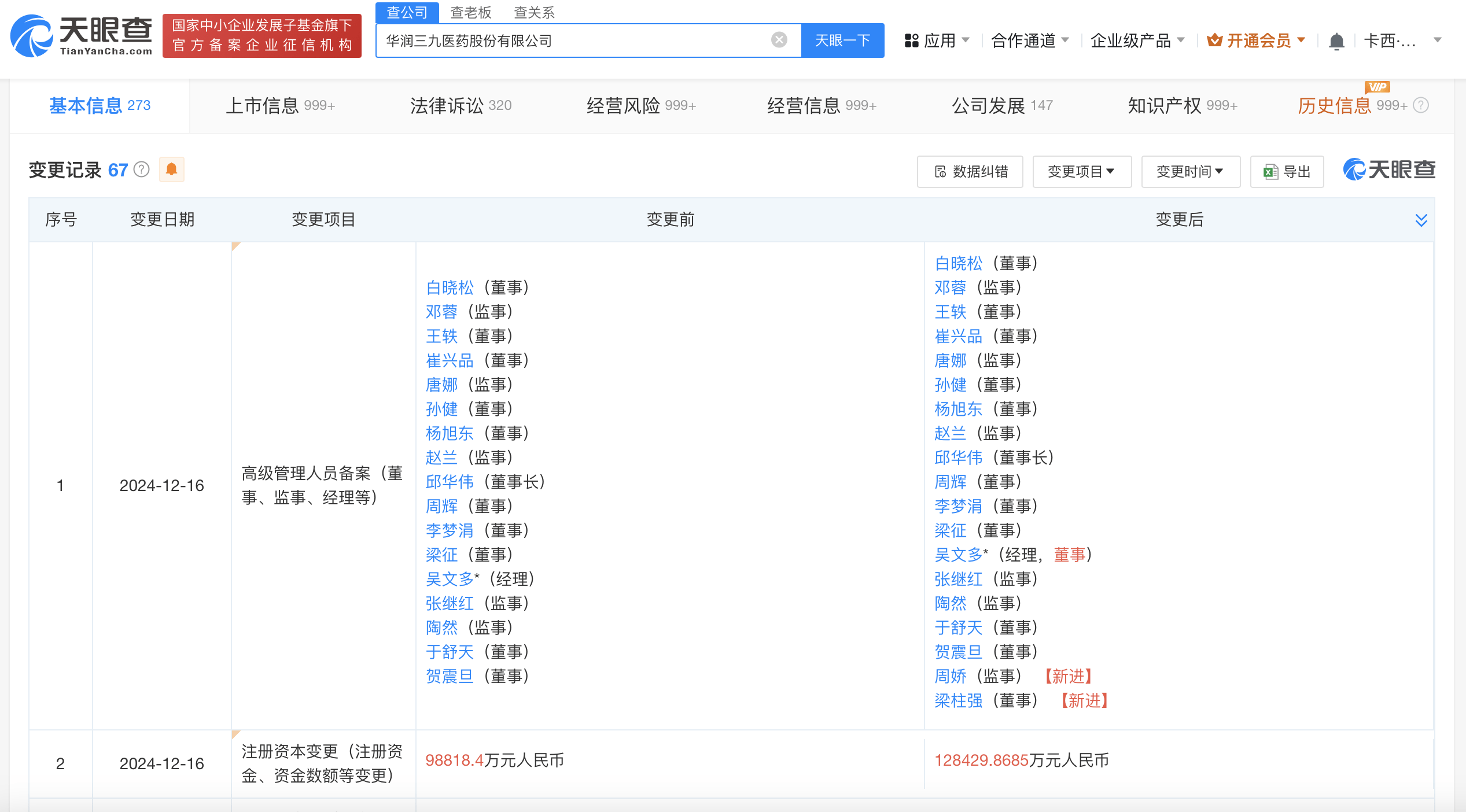 天眼查App显示,近日,华润三九(000999)发生工商变更,注册资本由约9.88亿人民币增至约12.84亿人民币,同时,多位主要人员也发生变更。