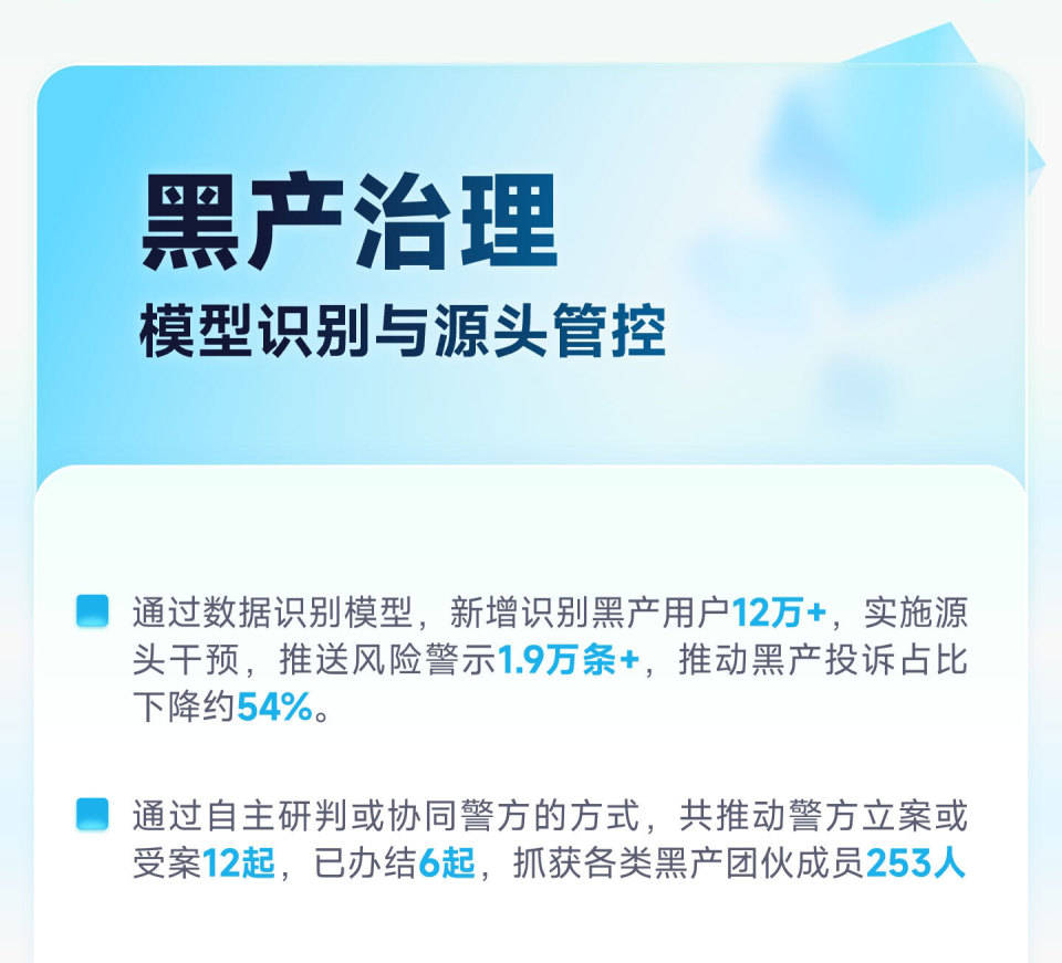 黑灰产治理:坚持源头管控与协同打击。2025年,奇富科技通过数据模型精准识别并干预黑产用户超12万,推动黑产投诉占比下降约54%。同时积极协同警方打击黑灰产违法犯罪,2025年共推动警方立案/受案12起,已办结6起,抓获各类黑产团伙成员253人,从源头上压缩黑灰产生存空间,切实维护金融秩序的稳定与清朗。