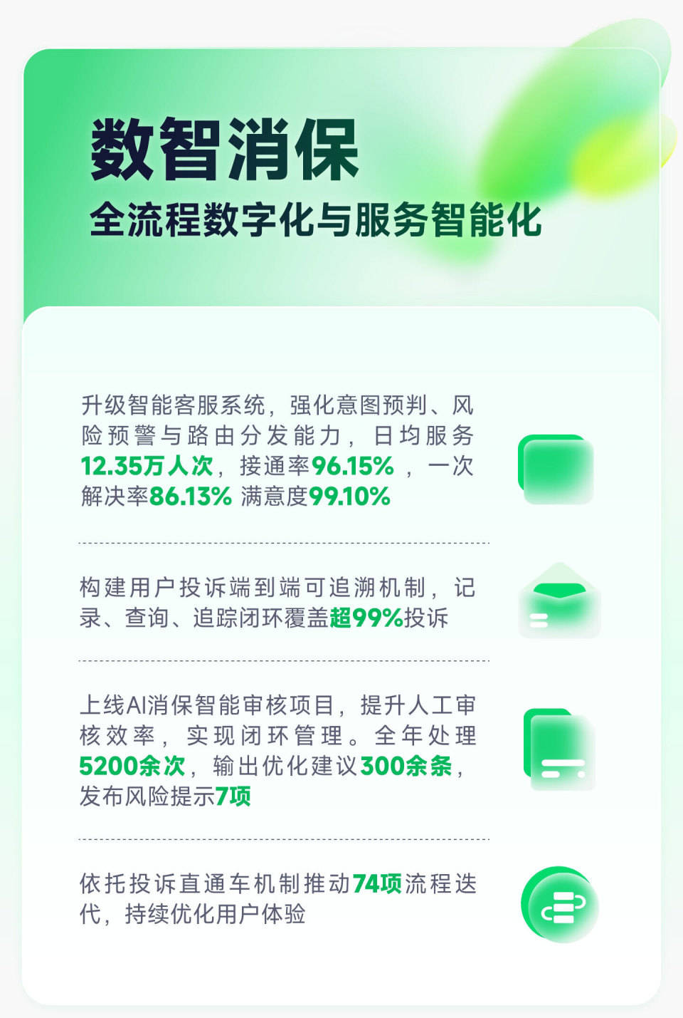 数智消保:让服务更有温度。奇富科技升级后的智能客服系统深度融合AI技术,在意图预判、风险预警与路由分发等核心环节实现能力跃升,日均服务12.35万人次,用户满意度保持在99.1%的高位。同时,我们构建了投诉端到端可追溯及投诉直通车机制,实现超99%投诉的闭环覆盖,确保消费者的每一个诉求都能被听见、被重视、被解决。