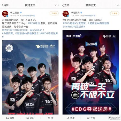EDG老板爱德朱旗下的珠江投资集团更是在官方微博上喊话:老板,能不能夺冠就送房,每个队员一套!并且还将这个Flag发到了EDG战队的微博超话里。其出手之阔绰引网友热议,有网友称“冠军值得!代表了电竞青春的热血”。