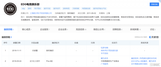 2018年5月,EDG电竞俱乐部完成近1亿人民币的Pre-A轮融资,投资方包括曜为资本、中国偶像娱乐产业基金、广州超竞。其中,曜为资本是专注于体育产业的投资机构,由姚明和其他行业专业投资人士共同成立;中国偶像娱乐产业基金由中投中财主导,在泛娱乐领域有深入布局。