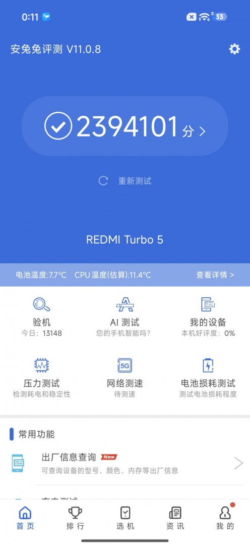 在安兔兔V11版本的跑分测试中,Turbo 5轻松突破了239万分大关。这个数字放在当下的中端机市场,足以让竞争对手感到压力。