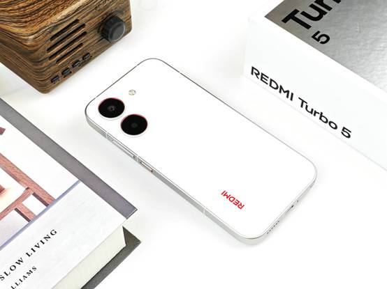 背部上方,Turbo 5的后置相机模组设计延续了整机"至简美学"的理念。双摄系统以竖直排列的方式嵌入背板左上角,两颗镜头外围的金属装饰环采用了与机身同色的处理,减少了视觉上的割裂感。主摄周围的红色点缀(在祥云白配色上尤为明显)为整机增添了一丝活力。
