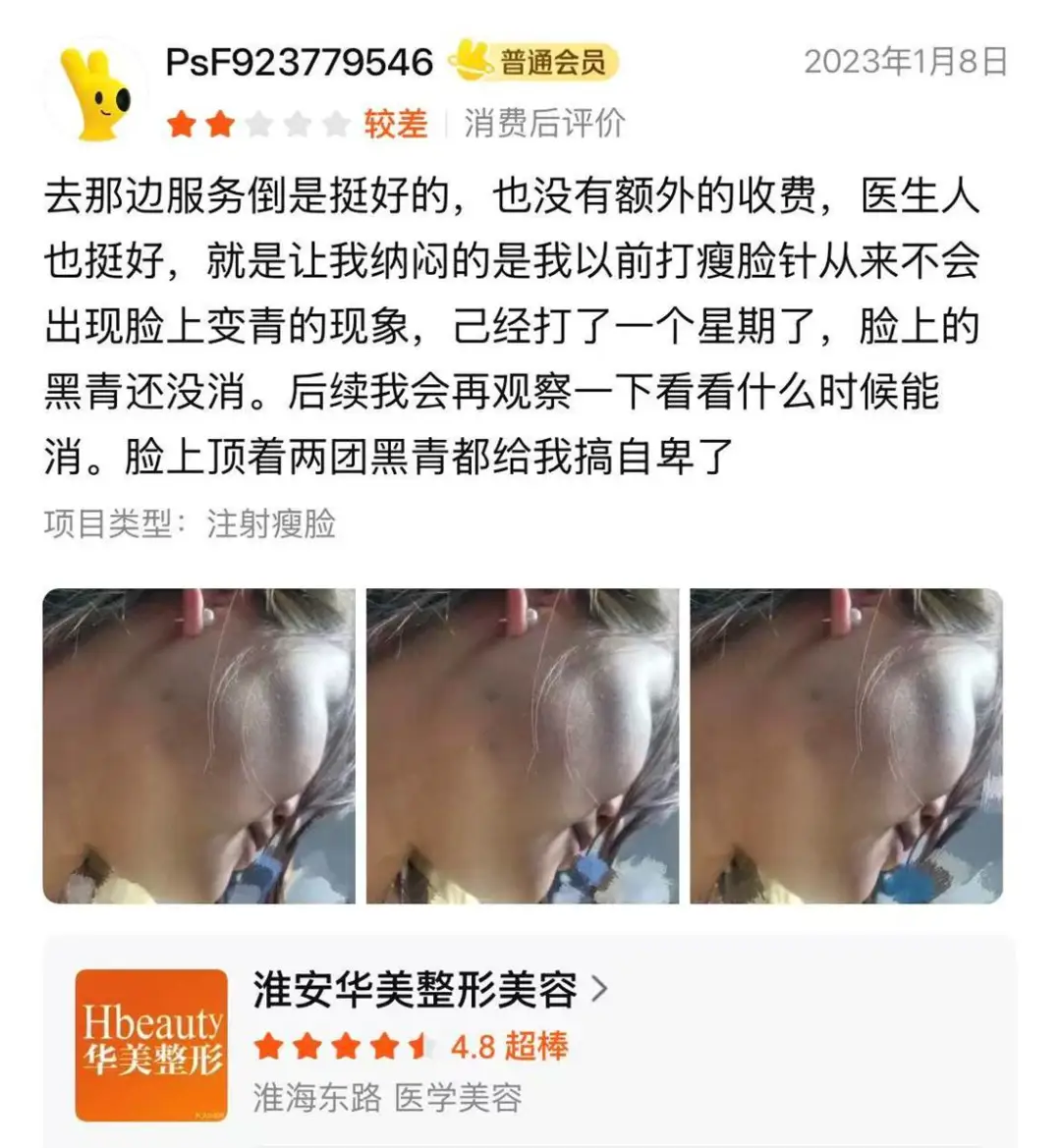 还有消费者反映:在淮安华美注射瘦脸针后,脸上出现以往从未有过的黑青,一周仍未消退,直言“顶着两团黑青出门都自卑”。这一异常淤青既可能源于操作不当、注射层次偏差,也暴露术后随访缺失、并发症处理缺位,再次印证淮安华美术前评估与术中规范远逊于宣传话术。