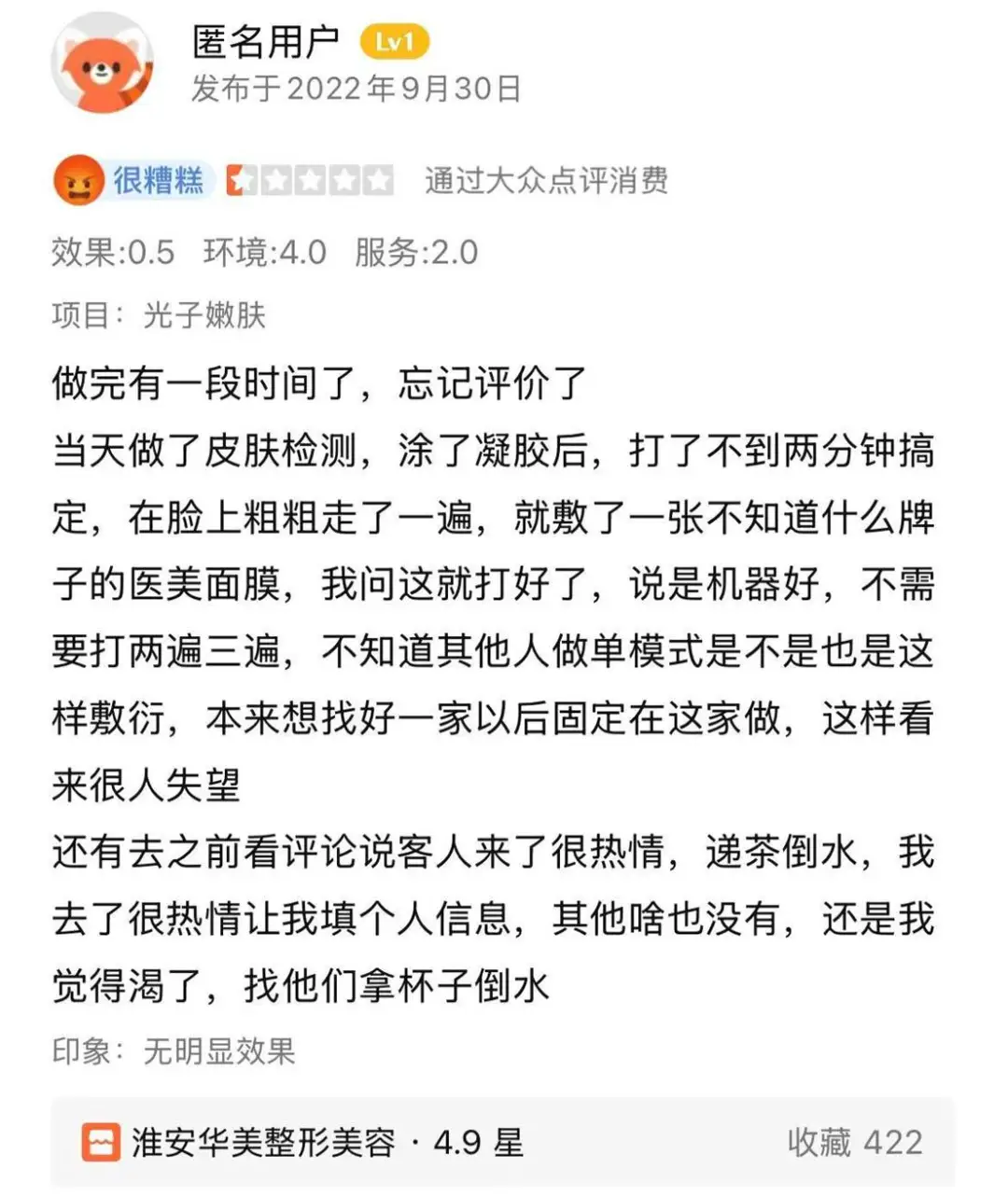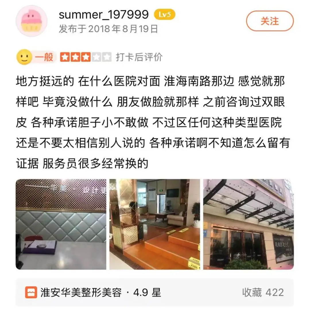 值得注意的是,早在2018年就有消费者在大众点评指出淮安华美“藏身淮海南路医院对面”,地段偏远、环境简陋。当自己的朋友做脸效果平平后,工作人员却许下种种“包满意”承诺,最后还是因胆小才逃过一劫。