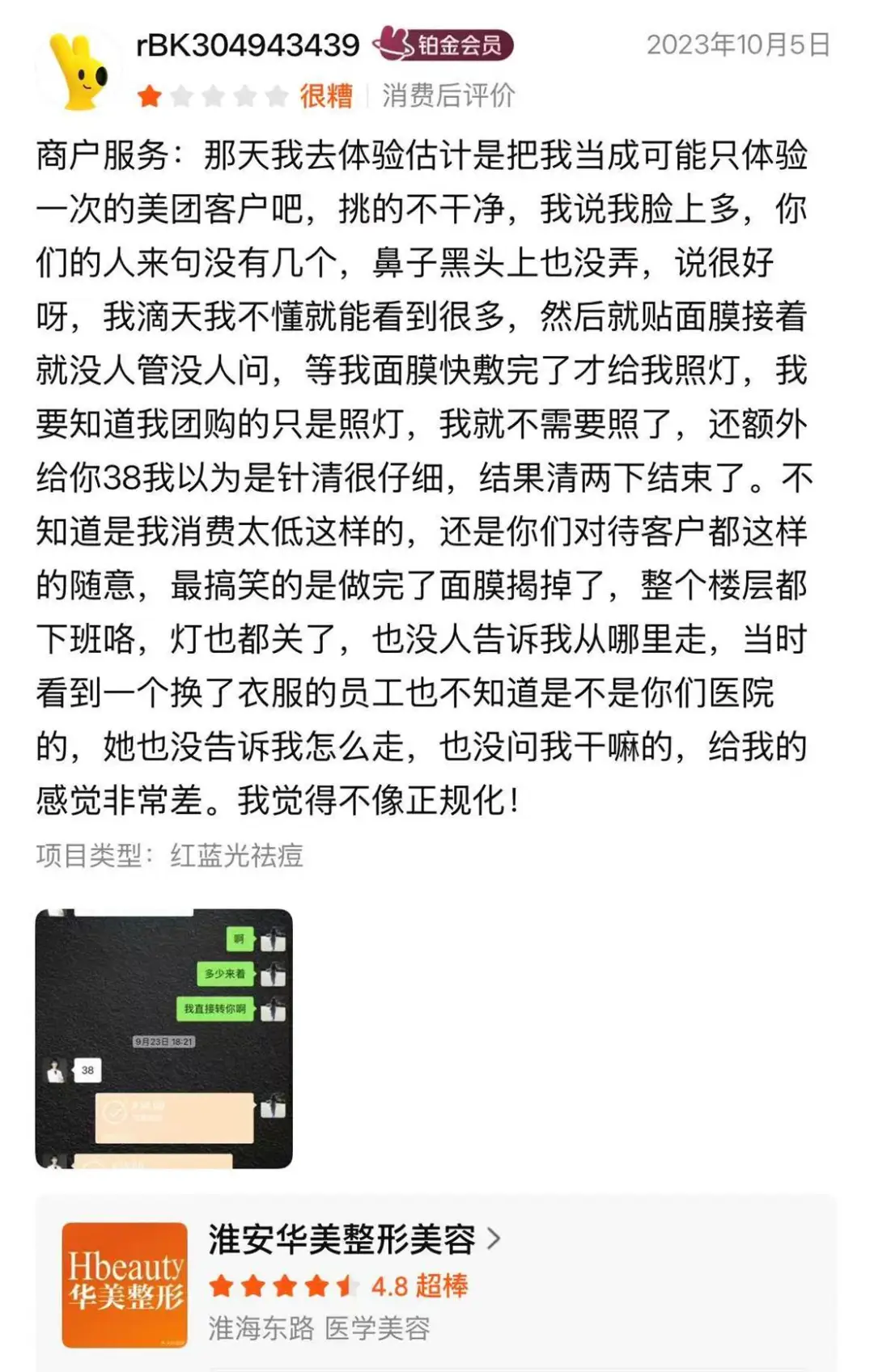 更离谱的是,照灯结束整层已熄灯下班,无人指引离场,顾客摸黑自行离开,把医疗场所做成“流水线关灯打烊”,暴露淮安华美前台与护理衔接混乱、服务培训缺位,毫无正规医疗机构应有的基本管理与尊重。