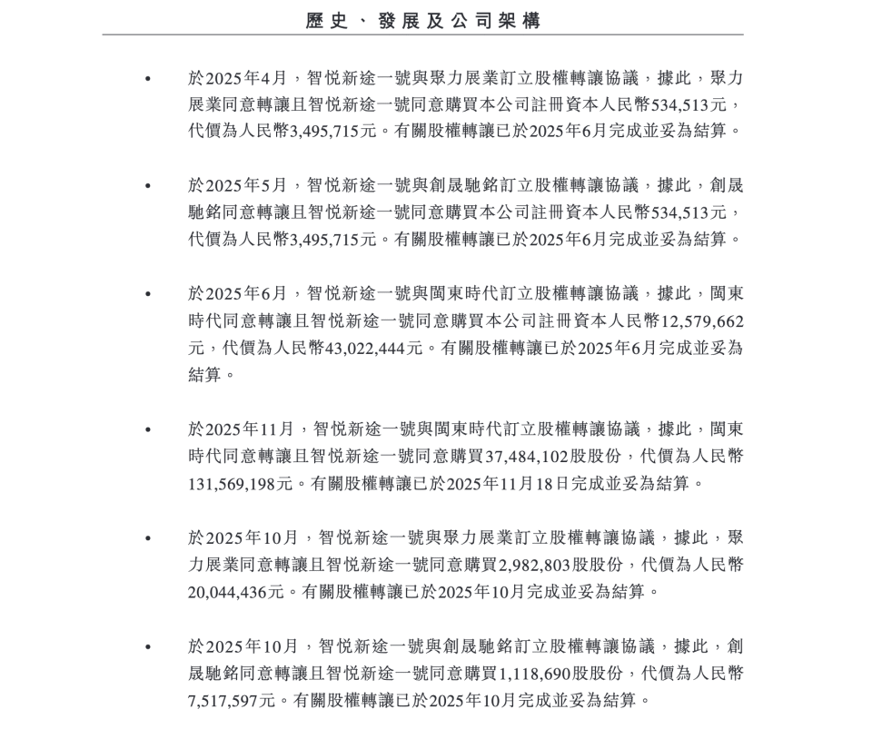 员工持股平台“上海智悦新途一号”在2024年至2025年间多次受让股份,价格显著低于市场公开融资价格。