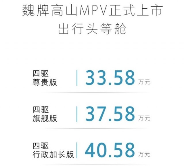 【TechWeb】10月18日消息,长城旗下首款MPV车型魏牌高山正式上市,共推出包括行政加长版在内的3款车型,售价区间为33.58-40.58万元。