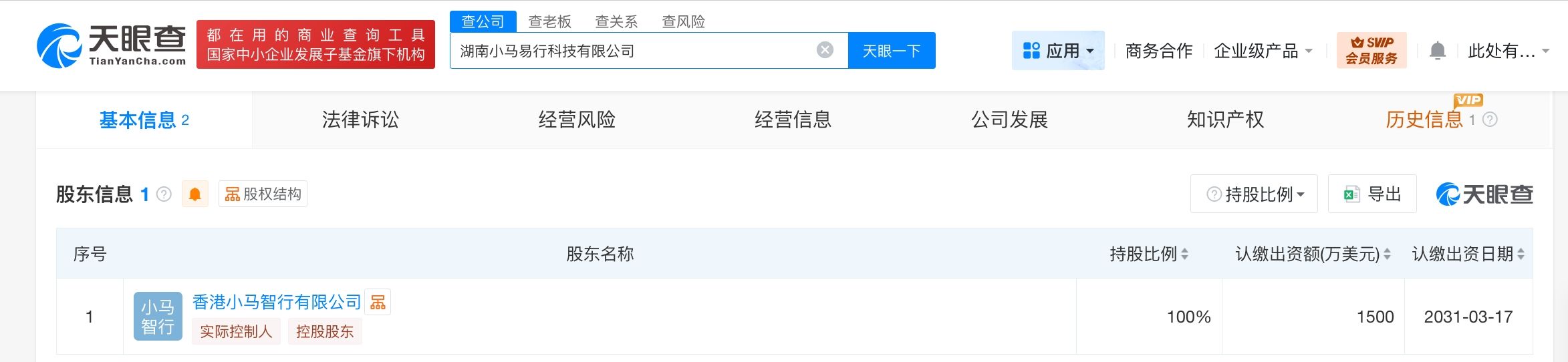 天眼查工商信息显示,近日,湖南小马易行科技有限公司成立,法定代表人为张宁,注册资本1500万美元,经营范围包括网络预约出租汽车经营服务、人工智能基础软件开发、智能车载设备制造、新能源汽车整车销售等。股东信息显示,该公司由香港小马智行有限公司全资持股。