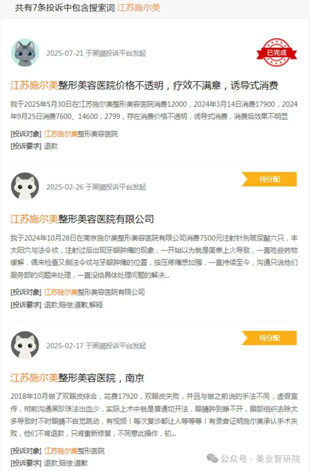 在黑猫投诉平台上,关于江苏施尔美的投诉量也不少。从投诉内容来看,售后推诿不退款的问题尤为突出。很多消费者在术后出现问题或者对效果不满意,要求退款时,都遭到了医院的拒绝。医院要么以各种理由拖延时间,要么直接不理会消费者的诉求,让消费者们维权无门。