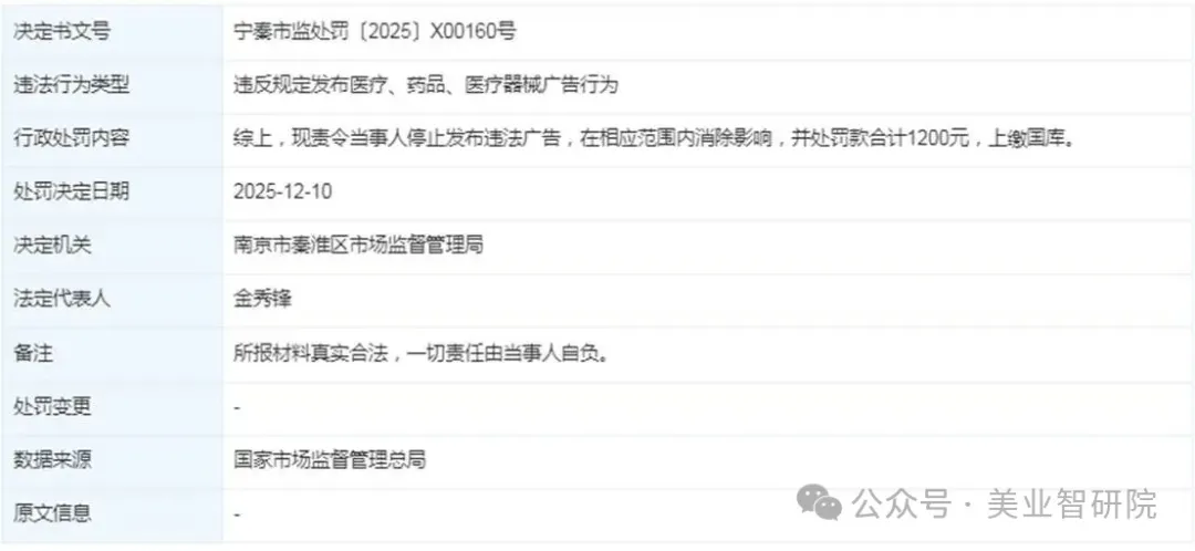 2025年12月10日,江苏施尔美因违反规定发布医疗、药品、医疗器械广告行为,被南京市秦淮区市场监督管理局处以罚款1200元的行政处罚。