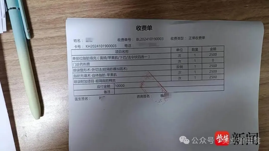去年10月,金女士怀揣着对美的期待,来到江苏施尔美整形美容医院,接受了眼袋外切、眼部脂肪回填、法令纹及印第安纹脂肪回填4个脸部医美项目,每个项目收费2500元,共计支付10000元。