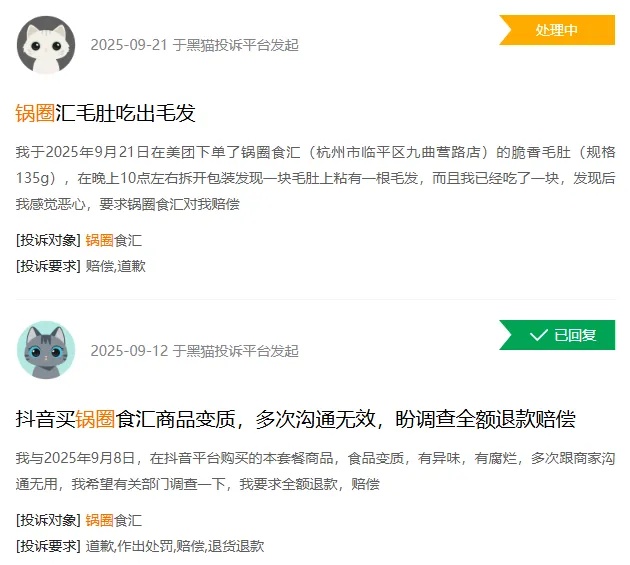 在黑猫投诉平台上以“锅圈”为关键词进行搜索,可以看到1600多条投诉,大多集中在食品中含有异物、食用后身体不适、售卖假货等。