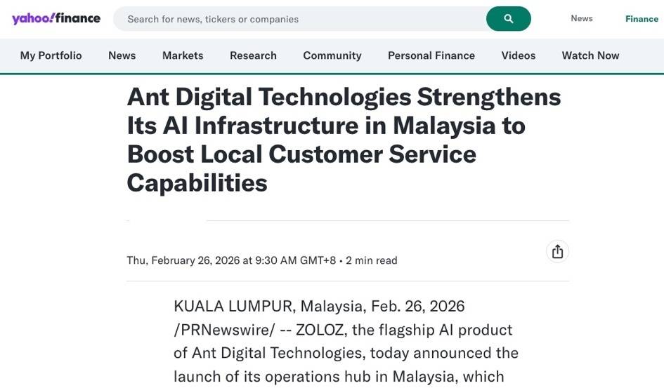 图说:海外媒体报道蚂蚁数科在马来西亚启动运营枢纽中心