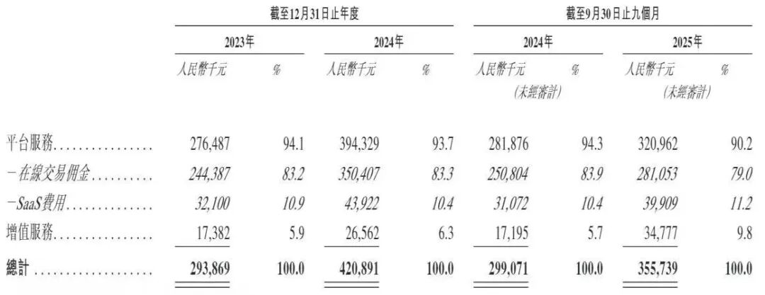 其中,在线交易服务是人人租的第一大收入来源,2023年至2025年前三季度实现收入2.44亿元、3.5亿元和2.81亿元,分别占总收入的83.2%、83.3%和79%;同期,SaaS服务实现3210万元、4392.2万元和3990.9万元,分别占总收入的10.9%、10.4%和11.2%。这意味着,平台服务收入始终占总营收的90%以上。业务结构的“偏科”,不仅限制了未来的想象空间,更将经营风险高度聚焦,成为其估值模型中不容忽视的减分项。