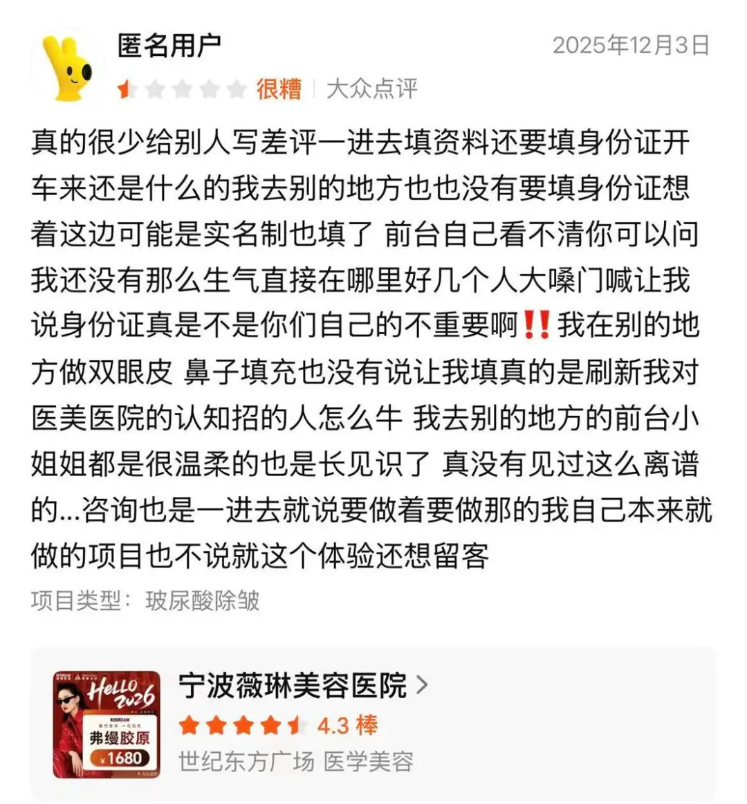 还有消费者指出,宁波薇琳进门先强制登记身份证,前台多人当众大嗓门反复索要号码,毫无隐私尊重。而咨询环节不先了解其已购项目,直接推销额外套餐,服务态度生硬。