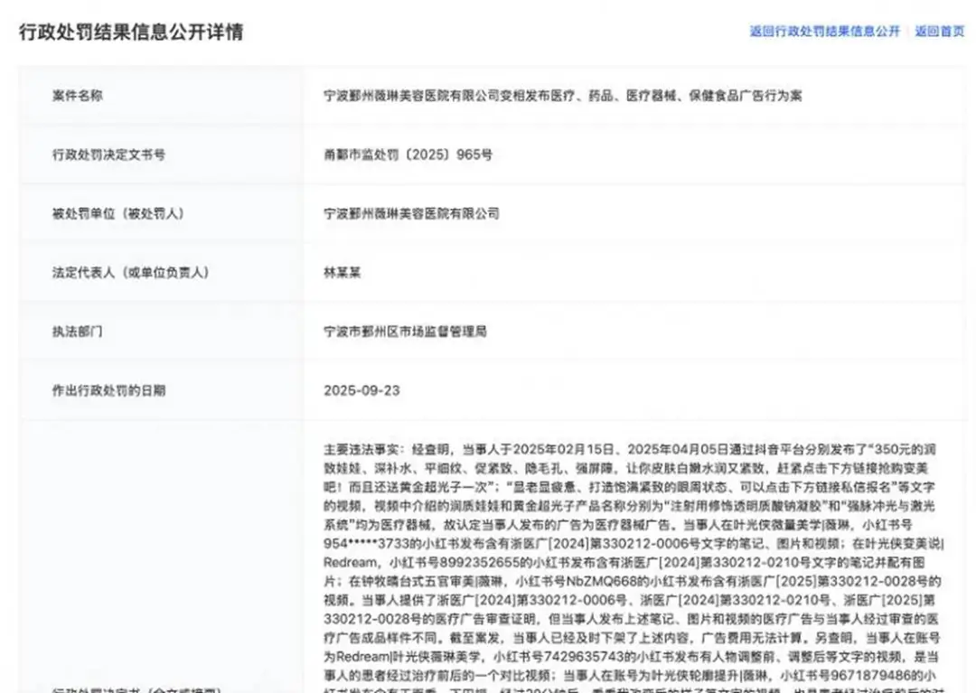 最近,浙江政务服务网公布的一则行政处罚决定书,把宁波鄞州薇琳美容医院(以下简称:宁波薇琳医美)推到了风口浪尖。