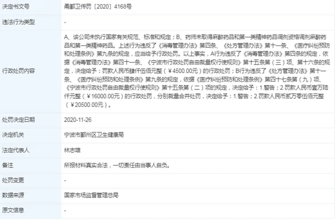 2020年11月26日,因未按国家规范、标准和规定执行消毒管理和药师在未取得麻醉药品和第一类精神药品调剂资格的情况下,仍调剂上述特殊药品,被宁波市鄞州区卫生健康局处于警告和罚款20500元。