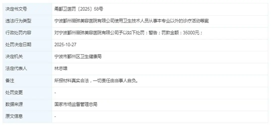 然而,到了2025年,宁波薇琳医美仍不知悔改。10月27日,它因使用卫生技术人员从事本专业以外的诊疗活动,以及未按照产品说明书的要求使用医疗器械,被宁波市鄞州区卫生健康局警告并罚款35000元。