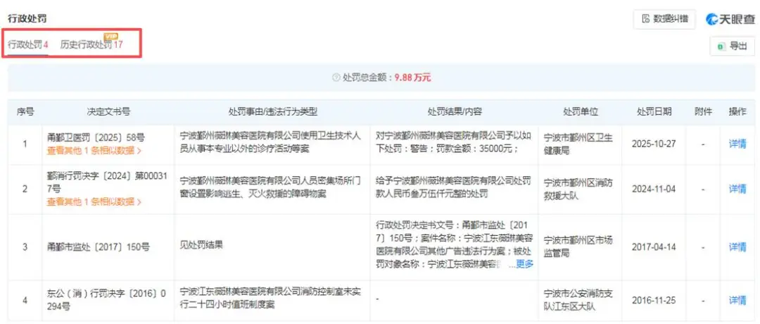 但天眼查上多达21条行政处罚记录,更是把宁波薇琳医美逼到了悬崖边。