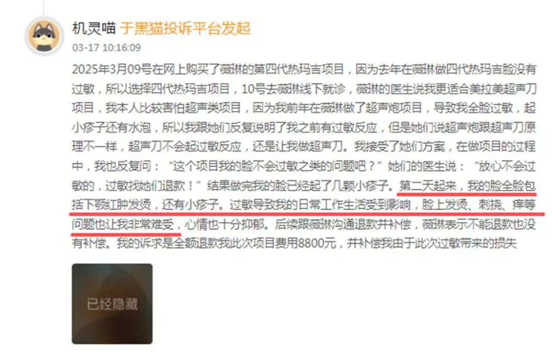 在黑猫投诉上,有消费者爆料,在宁波薇琳医美做完美拉美超声刀项目后,出现过敏反应,而机构却置之不理。