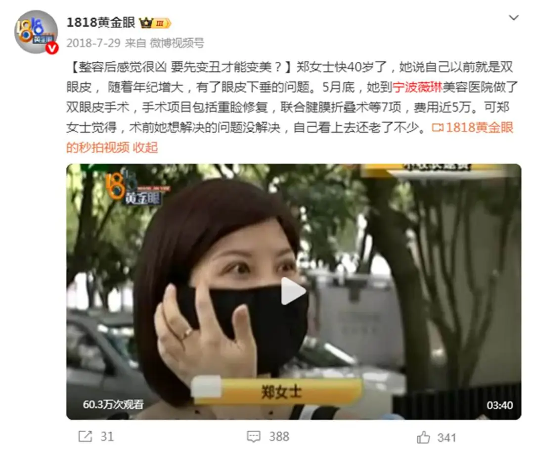 类似的案例还有很多。回溯至2018年,浙江电视台《181黄金眼》栏目报道,宁波的郑女士原本眼睛挺漂亮的,陪朋友去宁波薇琳医美时,被医生劝说做眼部手术,说能让她更精致、更漂亮。结果花了五万元做完手术,眼睛反而不好看了。