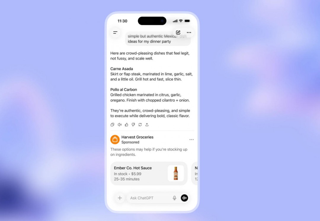 测试初期,当系统判断与用户当前对话相关的赞助产品或服务存在时,会在 ChatGPT 回答的底部展示广告。所有广告都会清晰标注,并与原始回答分开呈现。