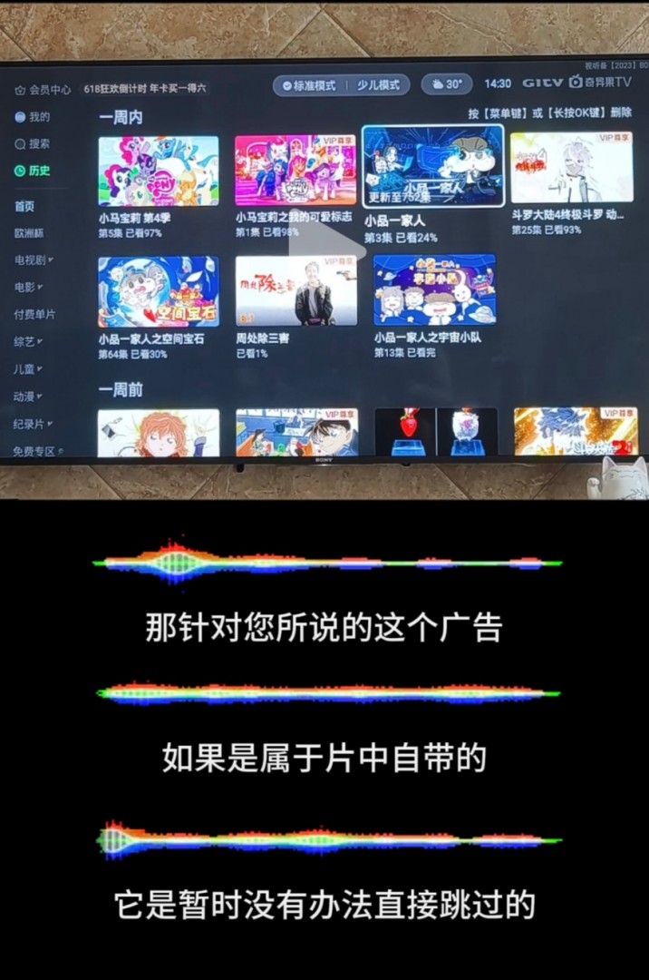 曾先生告诉TechWeb,他看到广告的视频是一个名为《小品一家人》的动画片,每集开头会播放大约5-6秒的广告,而每集的时间大约在1~2分钟。也就是说,广告时长接近正片的十分之一。他也试过客服建议的通过快进跳过广告,但是并没有成功,“在播放广告的时候按快进键没用,按下暂停看到的界面也和播放视频时不一样,关键是播放广告时是没有进度条的,这说明它并不是视频的一部分”。