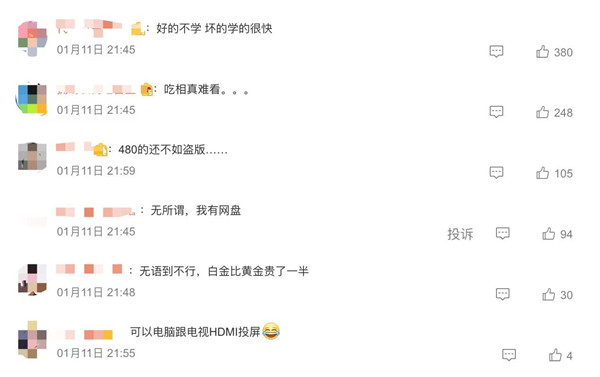 网友对视频平台的吐槽并不是新鲜事,去年,爱奇艺APP曾因为开始对投屏功能作出限制(黄金VIP会员只支持480P投屏,而之前支持最高4K清晰度投屏),被网友吐槽“吃相难看”,引发热议。