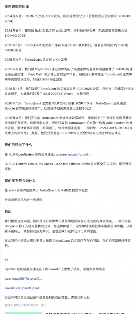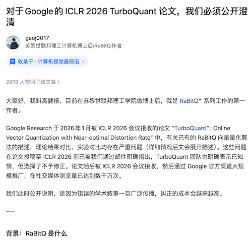 指控内容显示,高健扬是RaBitQ算法的第一作者,该算法早在2024年就已发表,并连续被两大顶会SIGMOD收录,代码完全开源。他直指谷歌的TurboQuant存在三方面严重问题。
