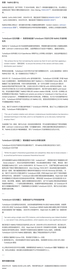 一是“核心技术回避”。高健扬指出,TurboQuant的核心方法——随机旋转与量化,与RaBitQ高度相似。然而,谷歌论文不仅刻意回避引用RaBitQ,还将审稿人要求讨论两者关系的意见置之不理,在终稿中将相关内容移至附录。