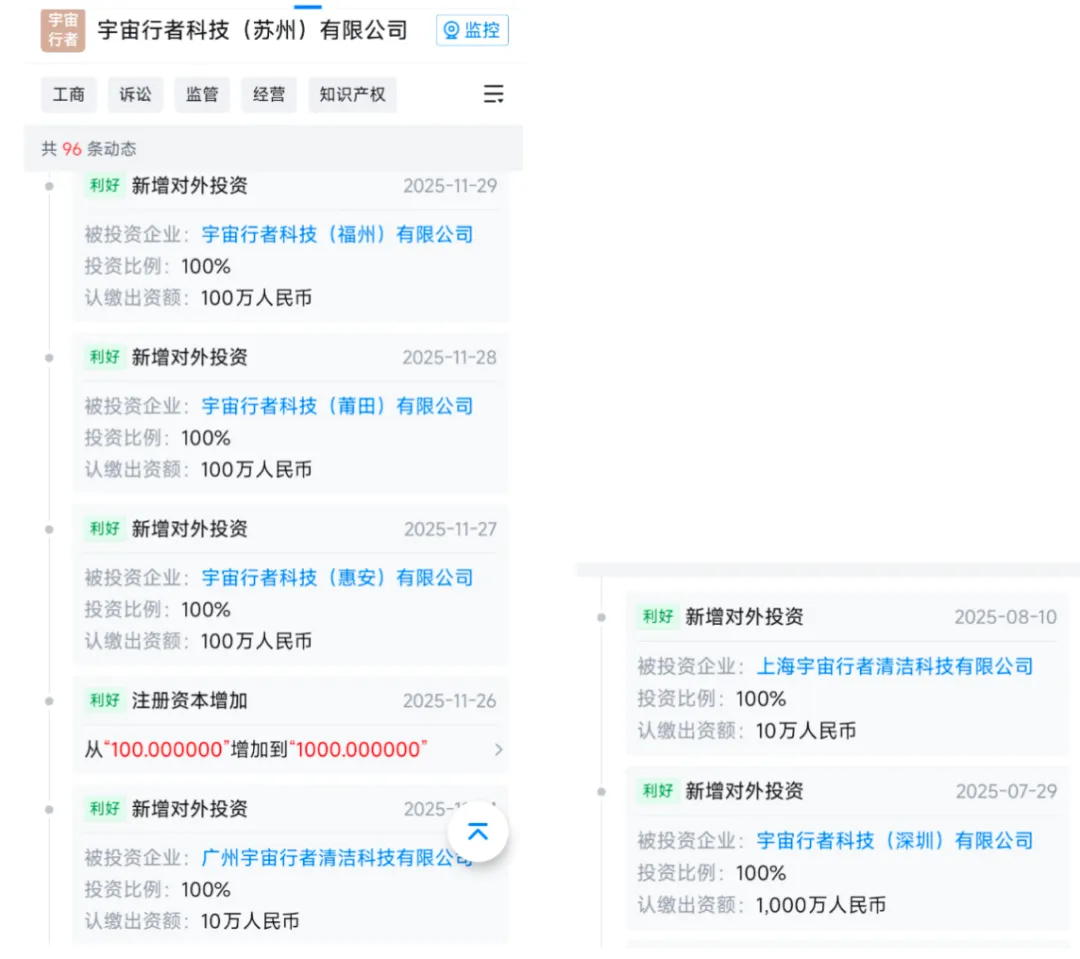 这背后,是一个成立仅一年多的高端清洁领域的新玩家。天眼查信息显示,MOVA品牌隶属于宇宙行者科技(苏州)有限公司(以下简称“宇宙行者科技”),该公司成立于2024年。值得注意的是,自今年7月以来,该公司密集在福州、莆田、惠安、上海、深圳等全国多地新增投资,其投资人及核心人员也发生了频繁变更。