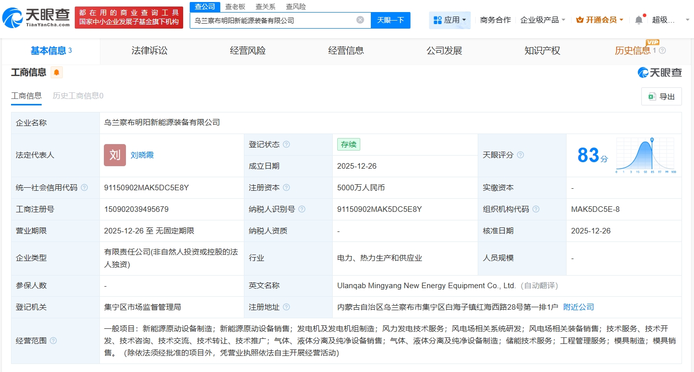 天眼查App显示,近日,乌兰察布明阳新能源装备有限公司成立,法定代表人为刘晓霞,注册资本5000万人民币,经营范围包括新能源原动设备制造、新能源原动设备销售、发电机及发电机组制造、风力发电技术服务等。股东信息显示,该公司由明阳智能旗下明阳新能源陆上装备总部集团有限公司全资持股。
