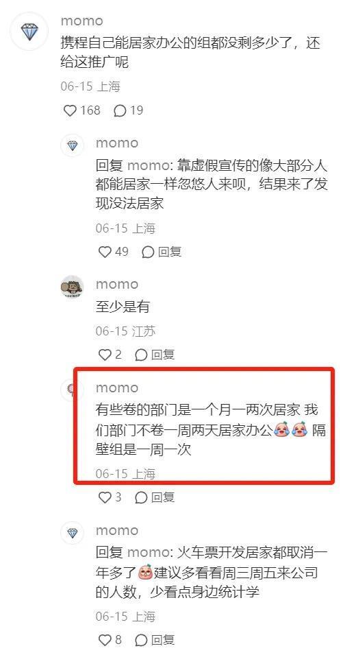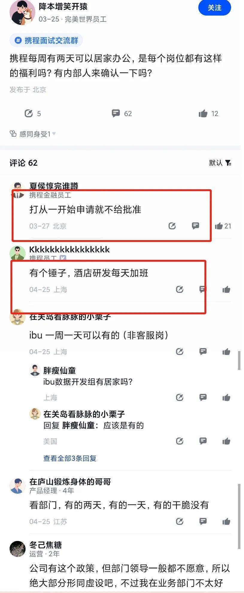 此外有认证为携程员工的网友表示,目前携程的居家办公分部门,有的现在依旧可以申请,但是有的部门陆续取消了。